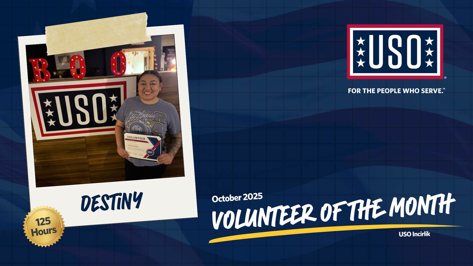 USO Incirlik is proud to recognize Destiny as our Volunteer of the Month for October 2025 for her incredible dedication, enthusiasm, and leadership. Since joining our team, Destiny has truly hit the ground running—immersing herself in nearly every facet of USO life. She is a proud member of our Fitness, Baking, and Game Night Committees, and quickly became a Lead Volunteer, helping to ensure smooth operations both in the center and beyond. Her proactive spirit and positive energy make her a joy to work with, and her consistent presence has made a lasting impact on the morale of our community.