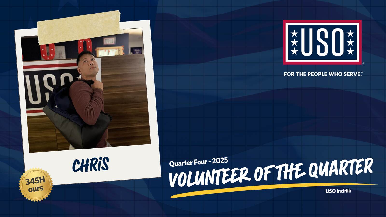 Volunteer of the Quarter – Quarter 4 2025: Chris! USO Incirlik is proud to recognize Chris as our Volunteer of the Quarter for his creativity, initiative, and unwavering positivity. From the moment he joined our team, Chris has been an unstoppable force of energy and innovation. Within weeks of volunteering, he earned Rookie of the Month and quickly advanced to Lead Volunteer, taking on projects and programs that have truly elevated the center. With 330 hours served at Incirlik and 435 lifetime hours, including previous service with the USO in Abu Dhabi, Chris continues to embody the spirit of dedication and connection that defines our mission.